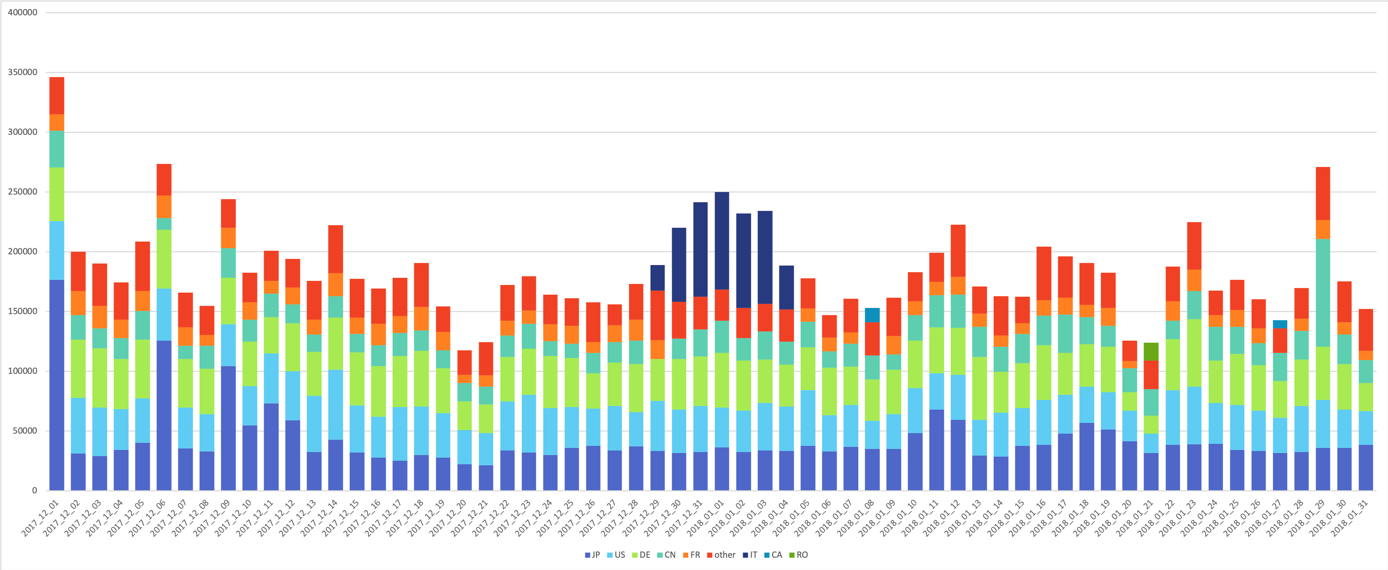 上記期間で攻撃検知の多い国のトップ5は、アメリカ(US)、日本(JP)、中国(CN)、ドイツ(DE)、フランス(FR)となっていますが、2017年12月29日〜2018年1月4日の期間でのみ、イタリア(IT)からの攻撃が多く検知されていることがわかります。