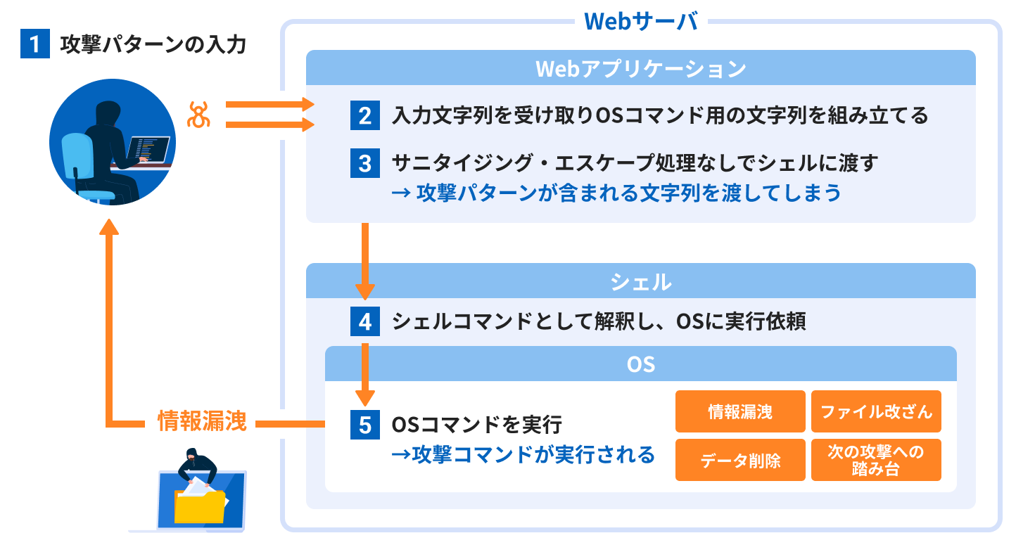 OSコマンドインジェクションとは、Webアプリケーションの脆弱性を悪用し、攻撃者がサーバのOSに対し、意図しない不正な命令(コマンド)を注入し、それを実行させるサイバー攻撃です。