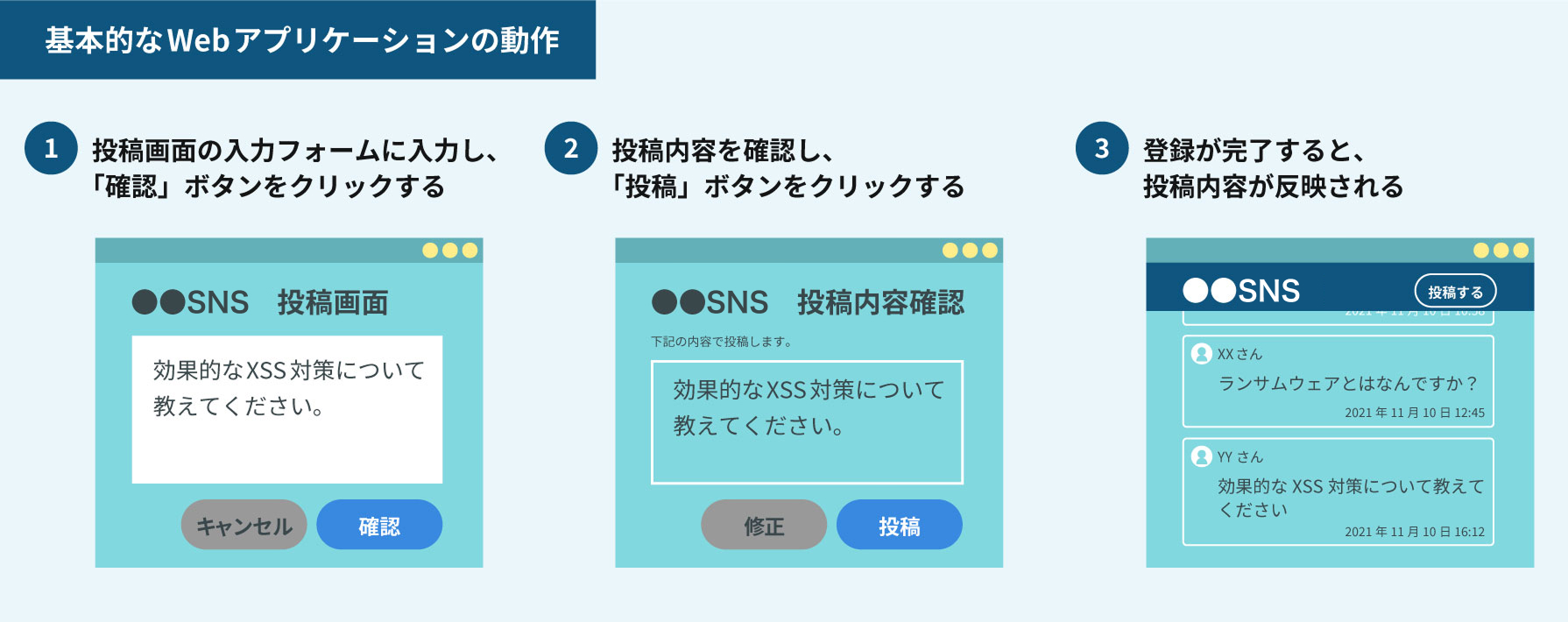 入力内容をそのまま受け付ける設計の場合、攻撃者は任意の文字列を送信できます。その中にスクリプトを含めることで、利用者のブラウザ上で任意の処理を実行させることが可能になります。