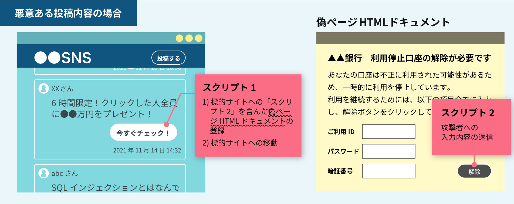 図の例では、悪意のあるユーザがSNSに【スクリプト1】を埋め込んだ投稿を行い、ボタンのように見せかけています。別のSNS利用者が「今すぐチェック」をクリックすると、あらかじめ用意された偽のページへ遷移します。